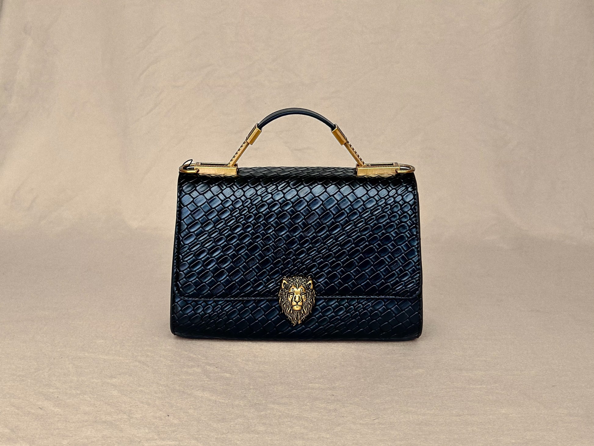 - Iconic lion-head clasp with gold-tone hardware