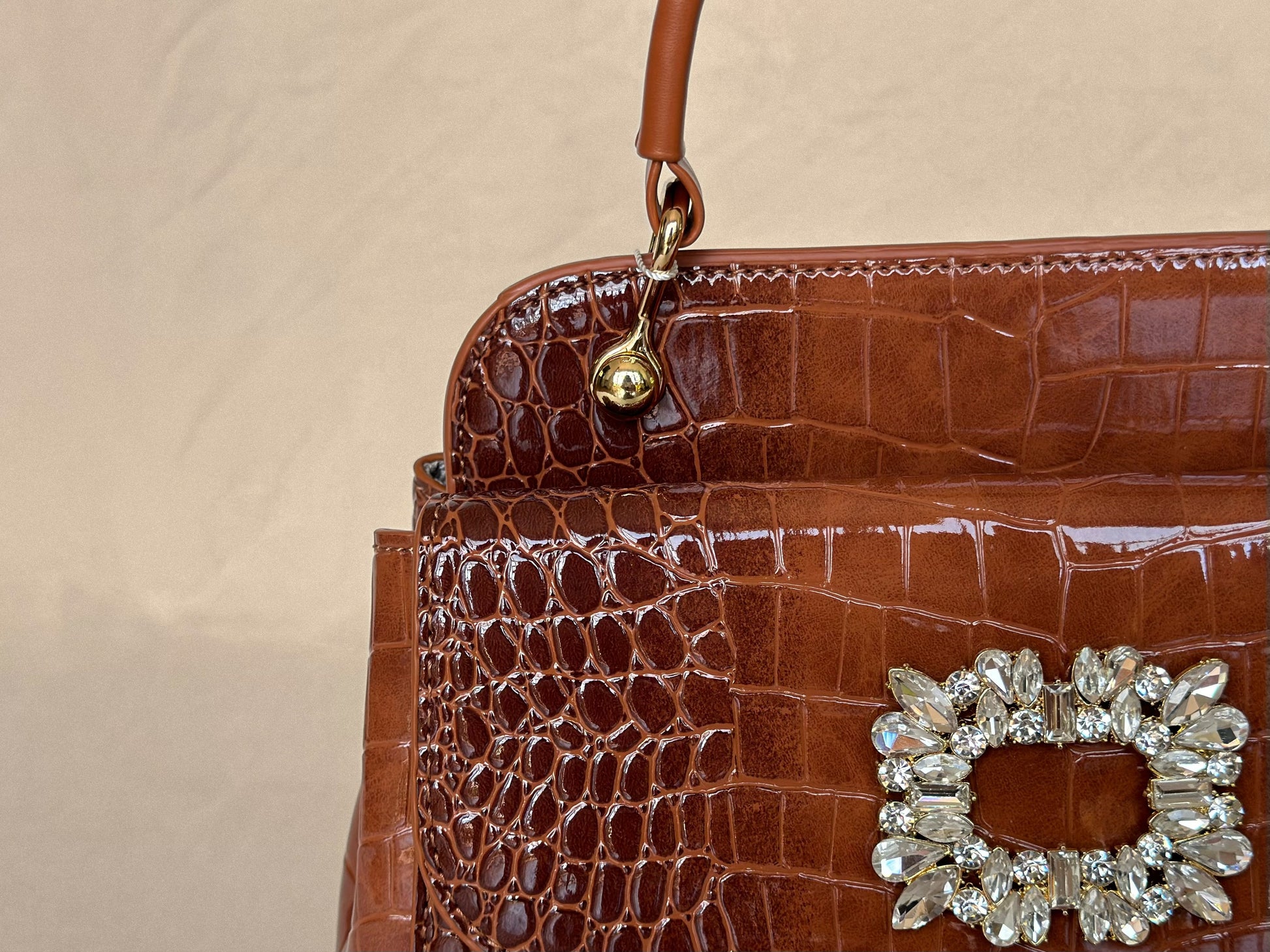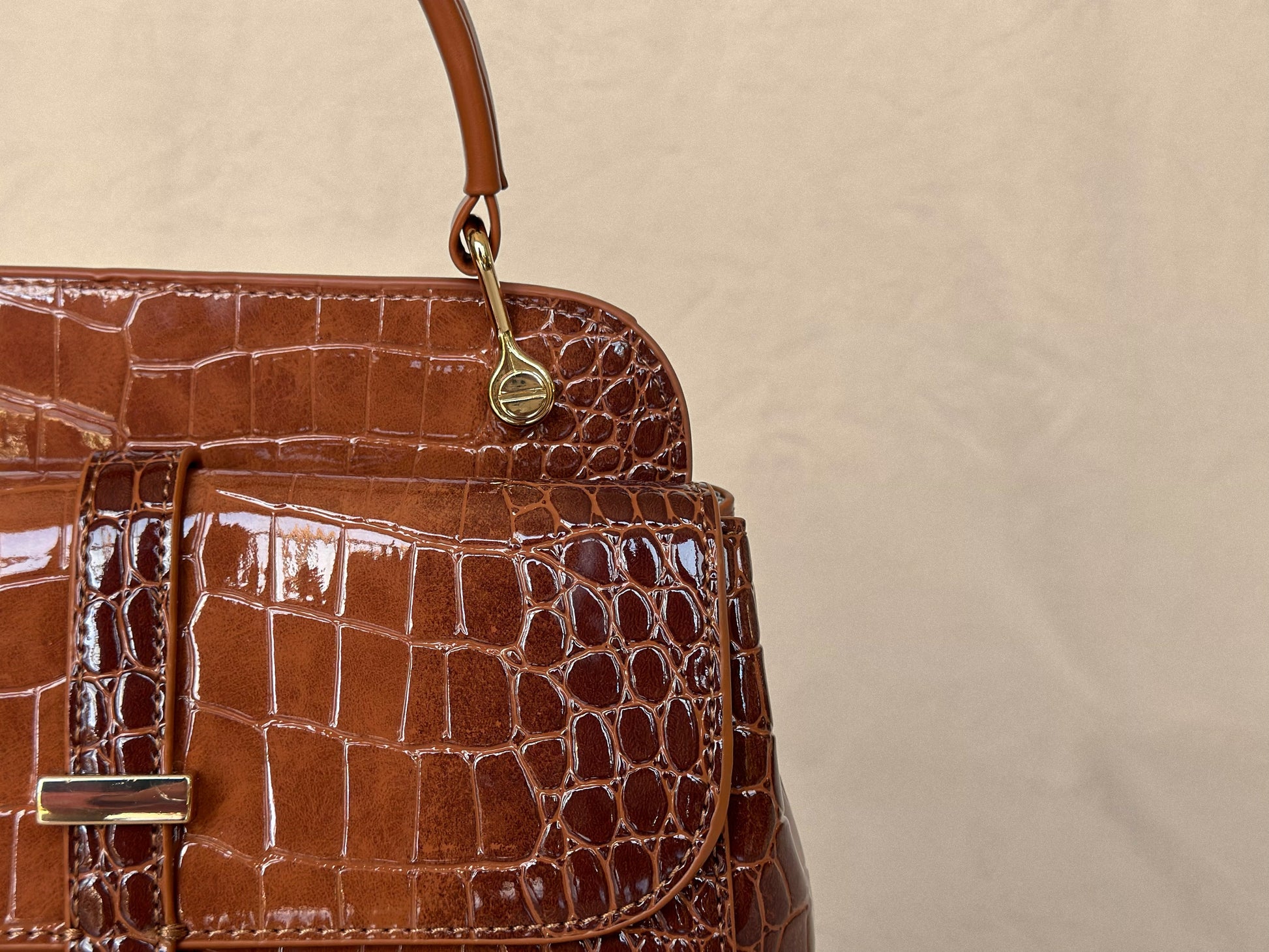 This croc-embossed bag features a dual-style design that provides versatility in both shape and styling. The warm coffee-brown color highlights the embossed texture, and the structured shape maintains a neat appearance throughout the day. You can carry it by the top handle for a classic look, or wear it crossbody for modern convenience.