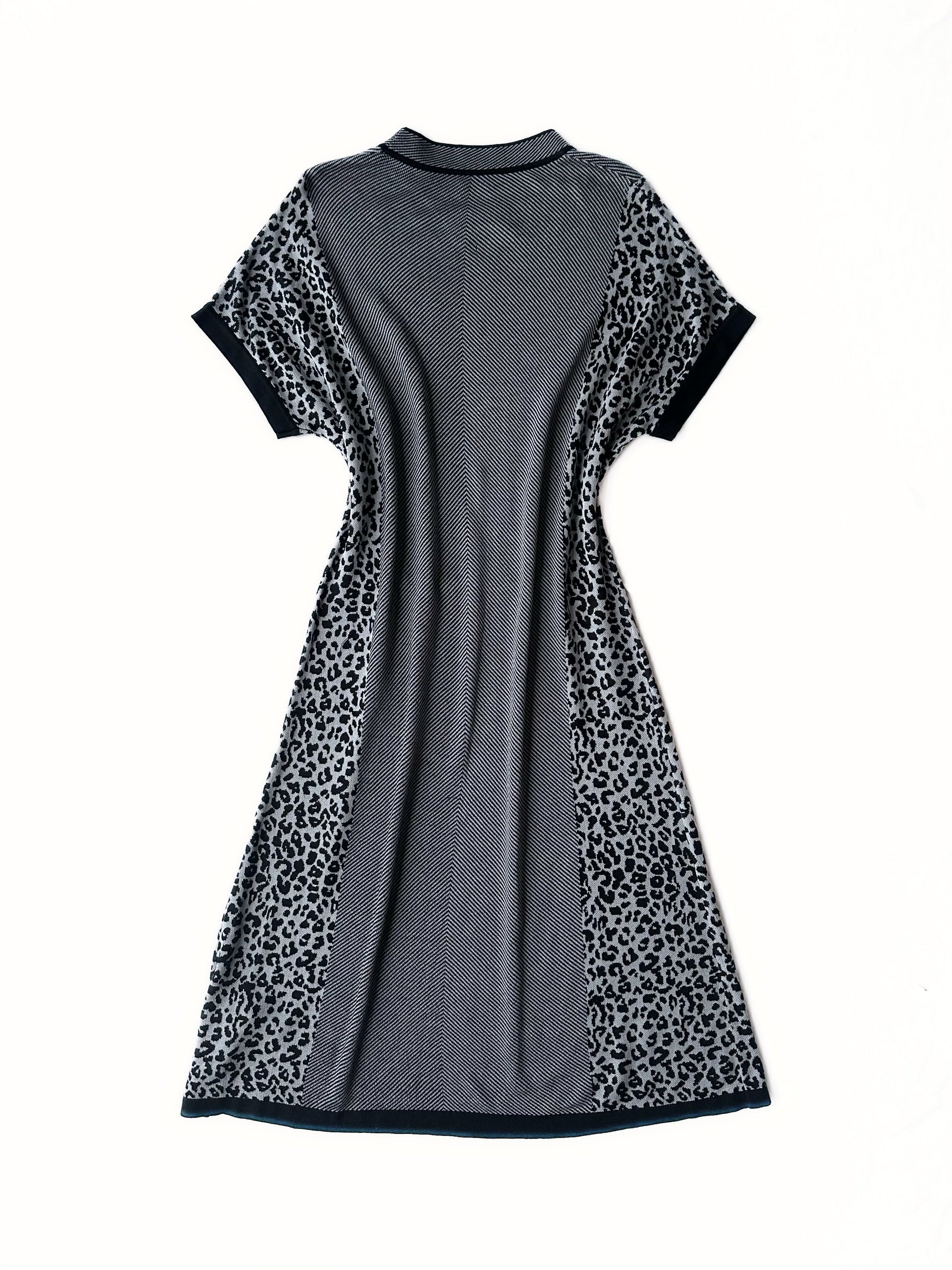 A modern straight-line dress featuring contrast graphic and leopard panel details. No waist shaping—designed for relaxed styling; can be cinched with a belt.